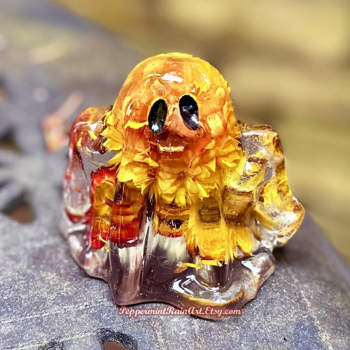 Handmade with epoxy resin, this cute ghost decor piece has real dried daisy flowers inside.