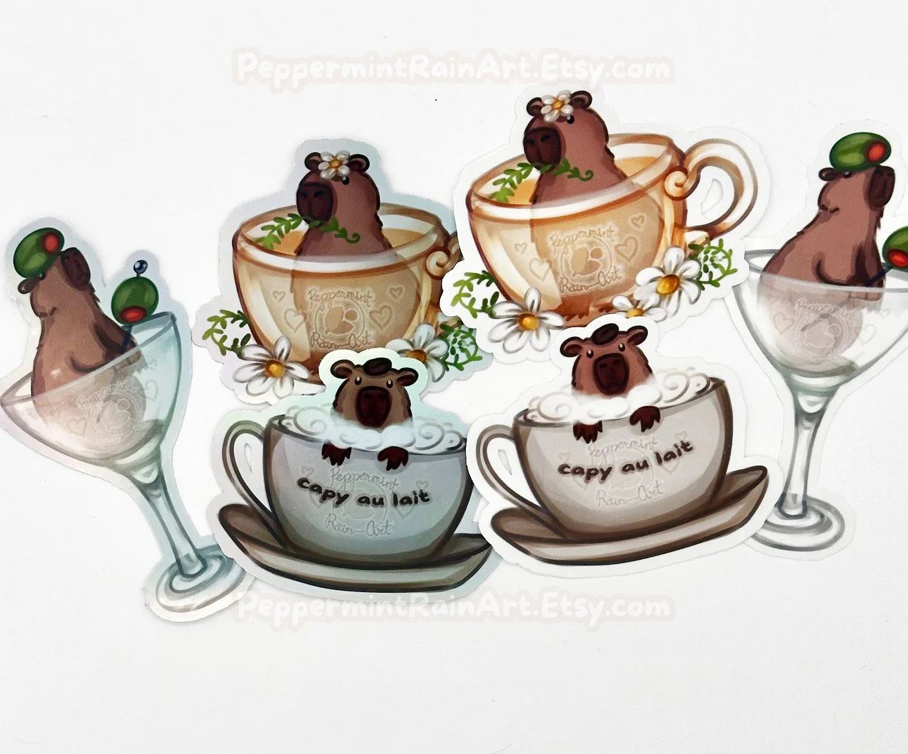 These cute stickers are made with original and hand-drawn digital art by me, PeppermintRain! Includes capytini (martini), capychamomile (chamomile tea), and capy au lait (latte).